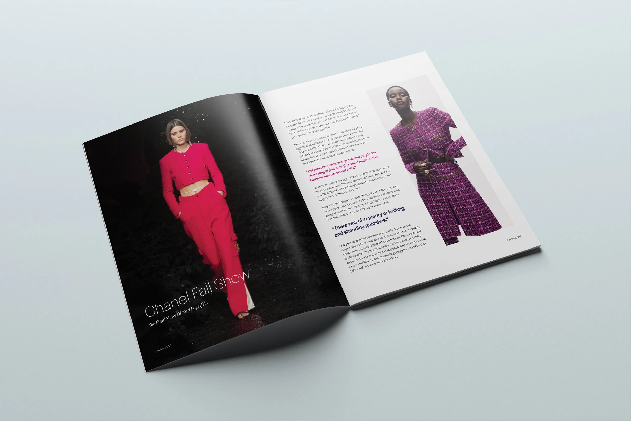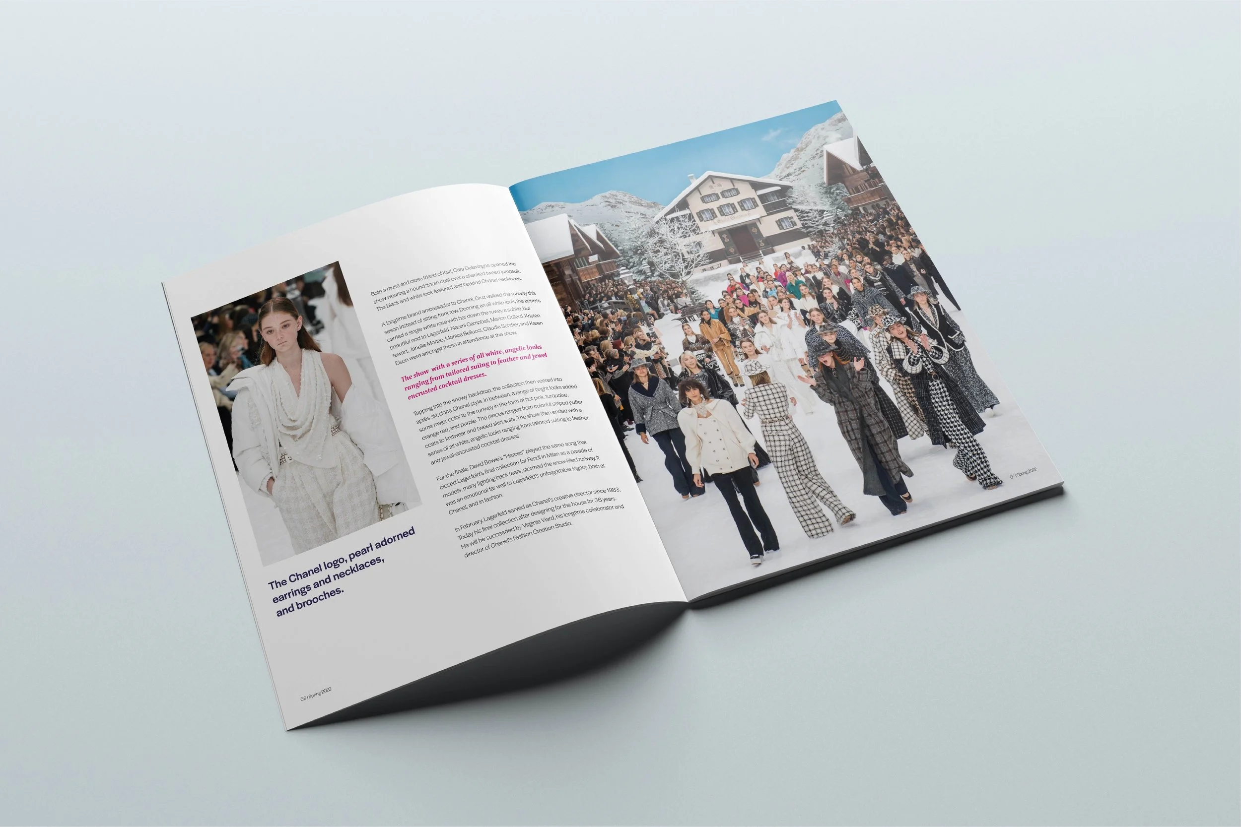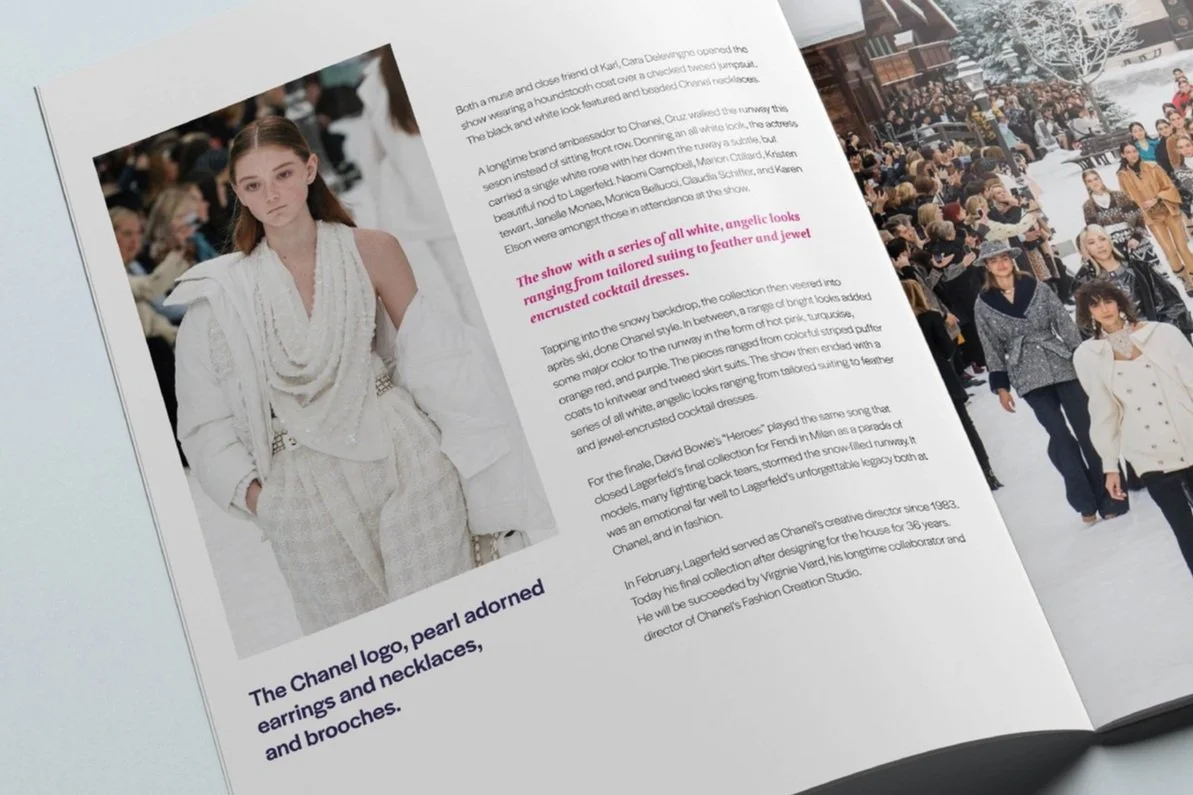 MODA is a renowned fashion magazine that features the latest trends and styles in the world of fashion. In this particular issue, the magazine has chosen to highlight Chanel's runway show as the inspiration for their editorial content, layout, and design.